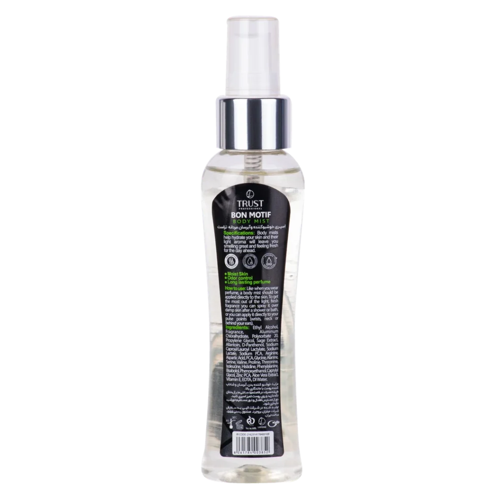 بادی میست مردانه تراست مدل Bon Motif با حجم 100 میل و رایحهای میوهای و خنک به شما ارائه میشود. نتهای اولیه آن شامل ترکیبی تازه از آناناس، انگور سیاه و سیب سبز است و با هم طوری ترکیب شدهاند که حس خنک و میوهای را برای شما ایجاد میکنند.