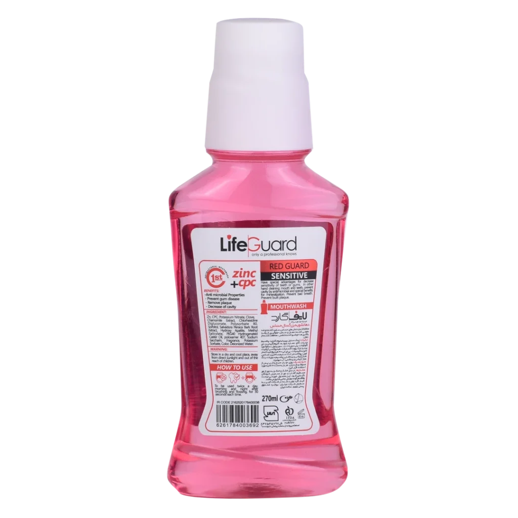و در نهایت، مهمترین ویژگی دهانشویه بزرگسال (Red Guard) برند لایف گارد، تأثیر بسزایی است که در کاهش حساسیت لثه و دندانها دارد و این کار را با مسدودسازی احساس درد توسط پتاسیم نیترات انجام میدهد. علاوه بر این ویژگی، در تمیز کردن حفره دهانی و پیشگیری از پوسیدگی دندانها نقش داشته و در استحکام دندانها بسیار تأثیرگذار است؛ این محصول، از بوی بد دهان پیشگیری کرده و جلوی تشکیل پلاک را نیز میگیرد. با این محصول، لبخندی درخشان را تجربه کنید، طعم خنکی و تازگی را بچشید و از سلامت حفره دهانیتان اطمینان حاصل کنید.