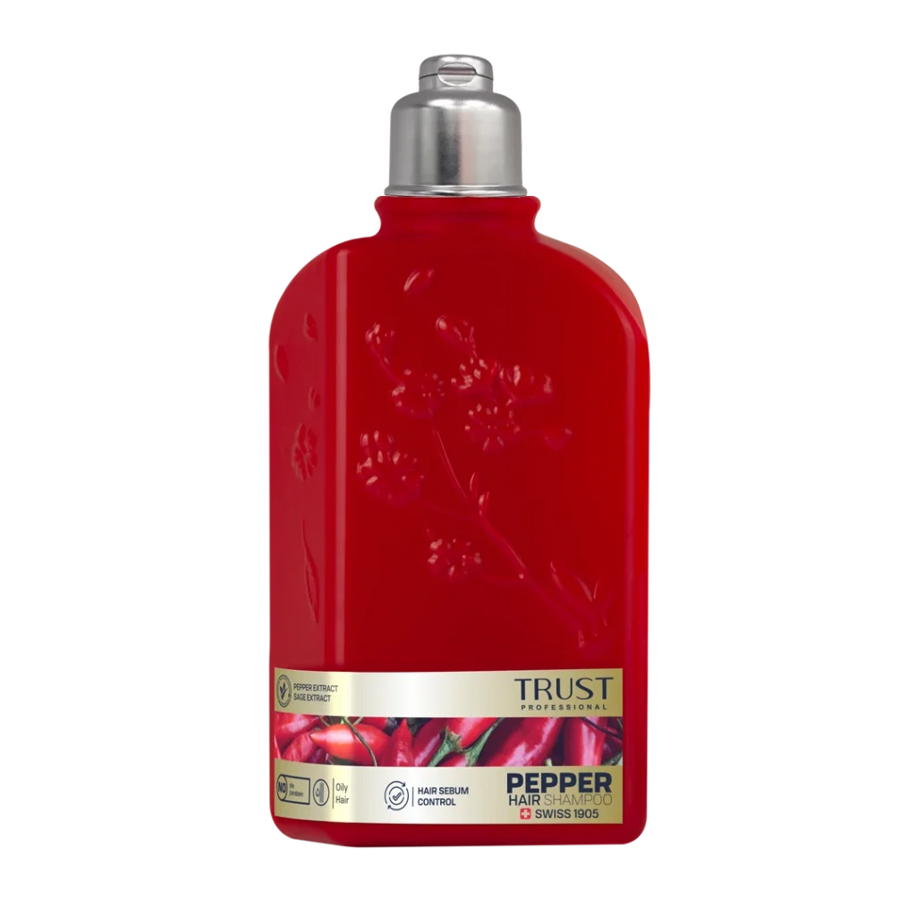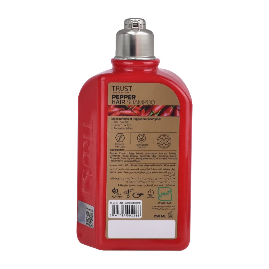 عصاره فلفل موجود در شامپو سر فلفل تراست، با تحریک فولیکولهای مو، به رشد بهتر مو و افزایش سلامت آن کمک میکند. علاوهبراین با افزایش گردش خون در پوست سر، از ریزش تارهای مو پیشگیری میکند. همچنین این محصول با داشتن عصاره مریمگلی در ترکیبات خود، ضمن کنترل چربی پوست، باعث براق شدن مو و رنگپذیری موهای خاکستری و بیرنگ میشود.