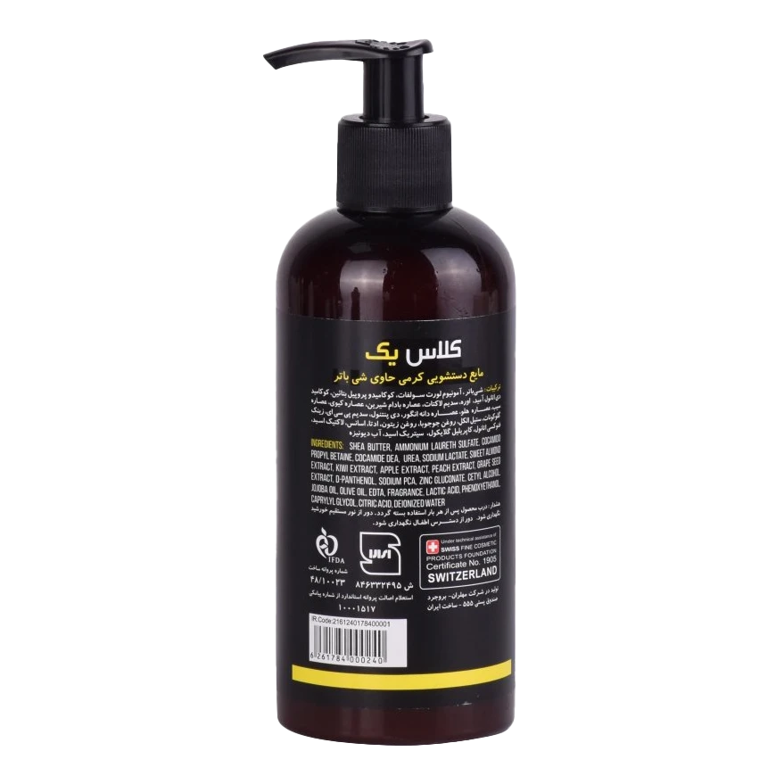 مایع دستشویی کرمی کلاس یک حاوی عصاره شی باتر، علاوه بر پاکسازی پوست از آلودگیها، آن را بهخوبی نرم کرده و آبرسانی میکند. شی باتر موجود در این محصول با داشتن اسیدهای چرب ضروری، سد طبیعی پوست را نیز تقویت می کند.